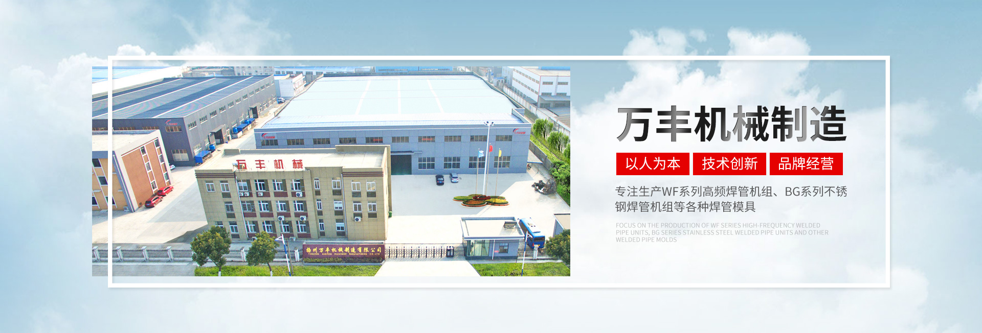 揚州萬豐機械制造有限公司坐落于揚州北郊槐泗工業園區,占地25000平方米,交通便利,是集開發、制造、銷售為一 體的焊管機組、模具制造企業。主要生產WF系列高頻焊管機組;BG系列不銹鋼焊管機組;GW系列型材冷彎成型機組;CQ系列車圈機以及各種焊管模具(12機組至508機組)型材模具。采用ISO9001: 2000國際質量標準,擁有完善的質量保證體系、嚴格的管理制度、先進的檢測手段和完善的售后服務隊伍。公司秉承“以人為本、技術創新、品牌經營、追求品質”的發展理念。堅持質量立企和品牌興企的發展戰略與時俱 進,將人才和先進的管理、完善的設計與服務相結合。不斷開發與創新使我們的產品始終處于同行前列地位,同時也得到國內了外廣大用戶的信賴和盛贊。         成功始于誠信,實力鑄就品牌,服務創造未來。二十一世紀是科技經濟高速發展的時代。競爭與發展并存,機遇與挑戰同在。萬豐人將以“忠誠、務實、拼搏、創新”為企業精神,以敏銳的目光昂揚的姿勢面向一個更加廣闊的市場和未來。